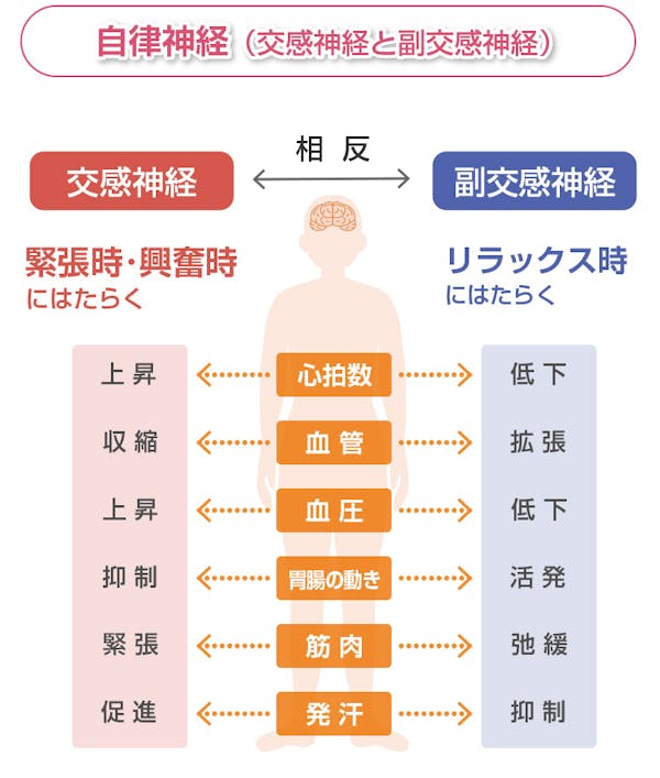 自律神経は互いに相反したはたらきをする交感神経と副交感神経に分けられ、緊張したり興奮したりしているときには交感神経、リラックスしているときには副交感神経が優位になります。